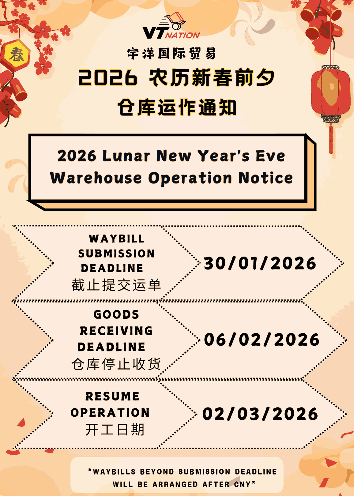 | Description | Caution! In order to ship quickly, please ensure you had make your payment. Warehouse will only ship customers parcel who cleared their shipping fees with status "WAIT FOR DELIVER". DELIVERY ORDER STATUS: "PENDING" --> "WAIT TO WEIGHT" --> "WAIT FOR PAYMENT" --> "WAIT FOR DELIVER" Calculation method of freight: No-Volumetric, Half-Volumetric (kg) Volumetric (Toss) weight does not exceed the actual weight of 10kg will use actual weight as charges. If the volumetric weight exceeds the actual weight by 10kg, volumetric weight + actual weight / 2 as weight charges. Example 1 The actual weight is 30kg, the volumetric weight is 39kg, weight differences does not exceed 10kg. Charges will based on 30kg; Example 2 The actual weight is 30kg and the volumetric weight is 61kg, weight differences does exceeded 10kg. Half-Volumetric = (31 + 61)/2, charged kg would be 45.5kg (round up to 46kg). Charges calculated according to below precedents: 1. If actual weight is more than volumetric weight. Actual weight alone will be taken as final weight 2. If volumetric weight is more than actual weight. Actual Weight + Volumetric Weight / 2 = final weight 3. Final weight x Charges per KG = Actual Charges *Actual Weight - The weight of the goods themselves, plus the weight of the packaging materials used for the goods. *Volumetric Weight - Length x Width x Height / 6000 **Please take note that the parcel delivery is send to ground floor only; if would like to send upstairs, additional fee is required. Kindly refer to the "Add-on Service Fees" (Delivery Upstairs Service) below. *【Food】Notice of storage period In view of the particularity of food: 1. Foods have a short storage period and are easily deteriorated in long-term storage. 2. Foods emit odors and are easy to bite by rats, insects and ants. △Food products. Arrange shipments as soon as possible after storage In the event of rat, insect and ant bite, no compensation will be accepted. ***【Refusal of flammable and explosive goods】***. For more detail explanation on our charges, terms and condition. Please visit --> https://vtnation.com.my/terms | |